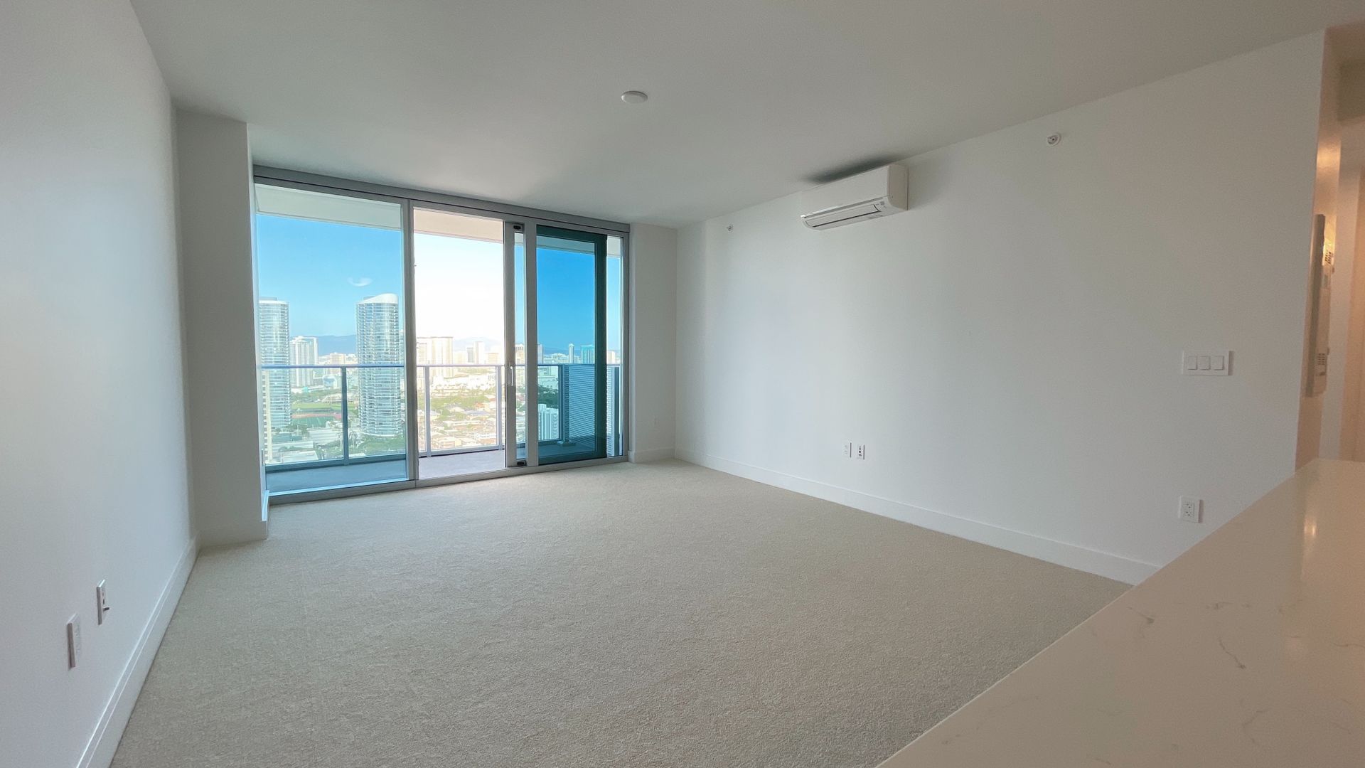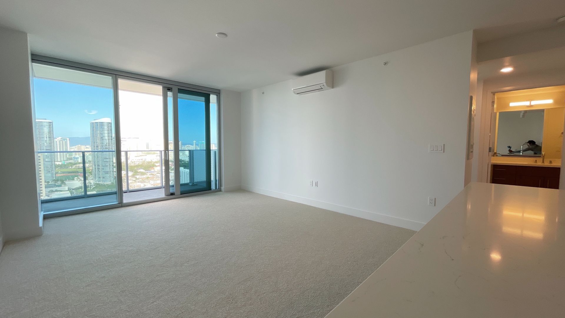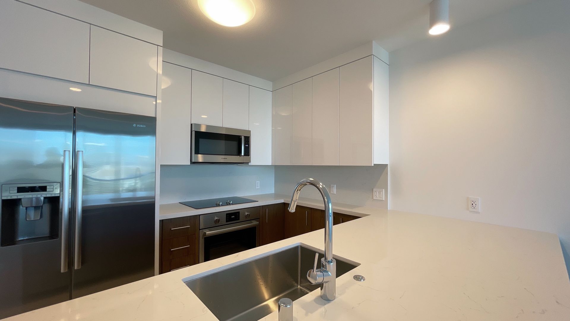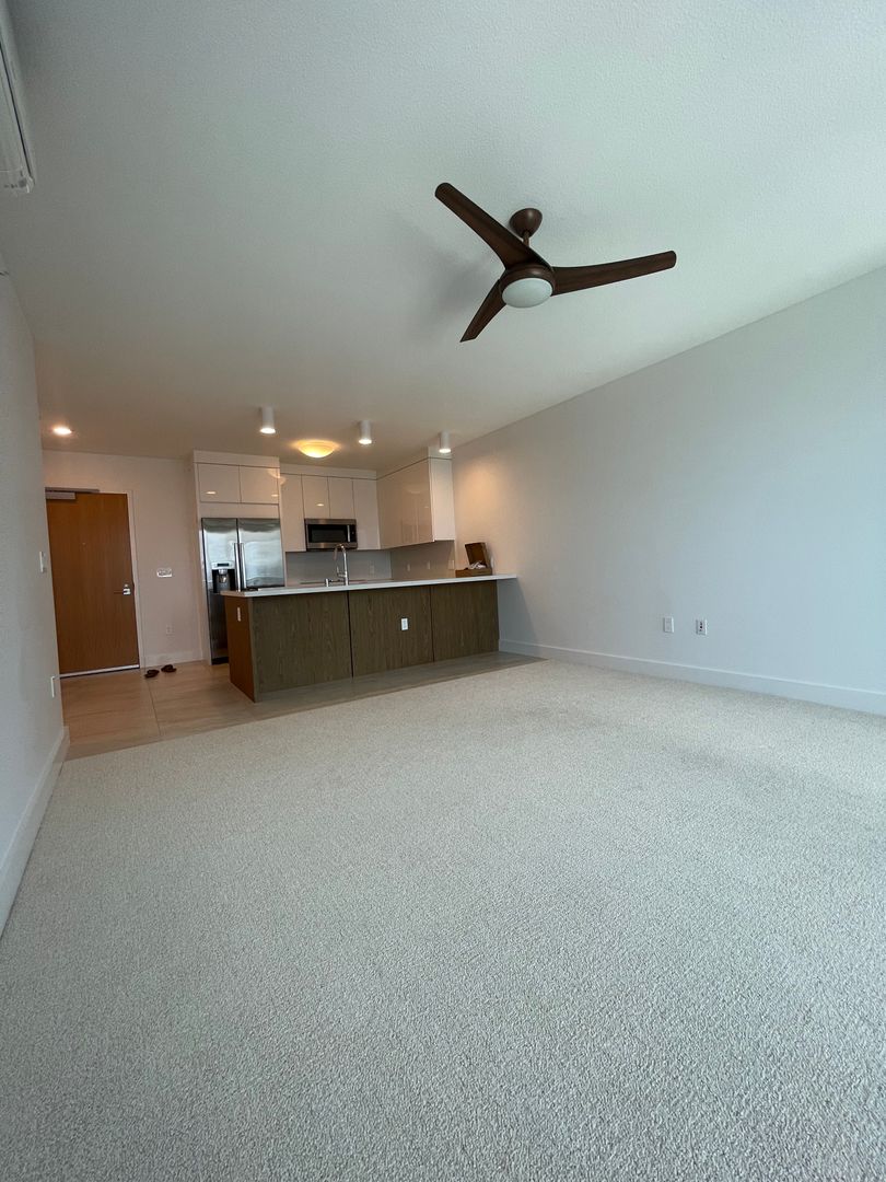 The contemporary kitchen is thoughtfully designed with Bosch stainless-steel appliances, quartz countertops, sleek cabinetry, and porcelain tile flooring, while the living area and bedroom are finished with plush wall-to-wall carpeting for comfort. Natural light and clean modern finishes create a bright, airy living space ideal for both relaxing and entertaining.